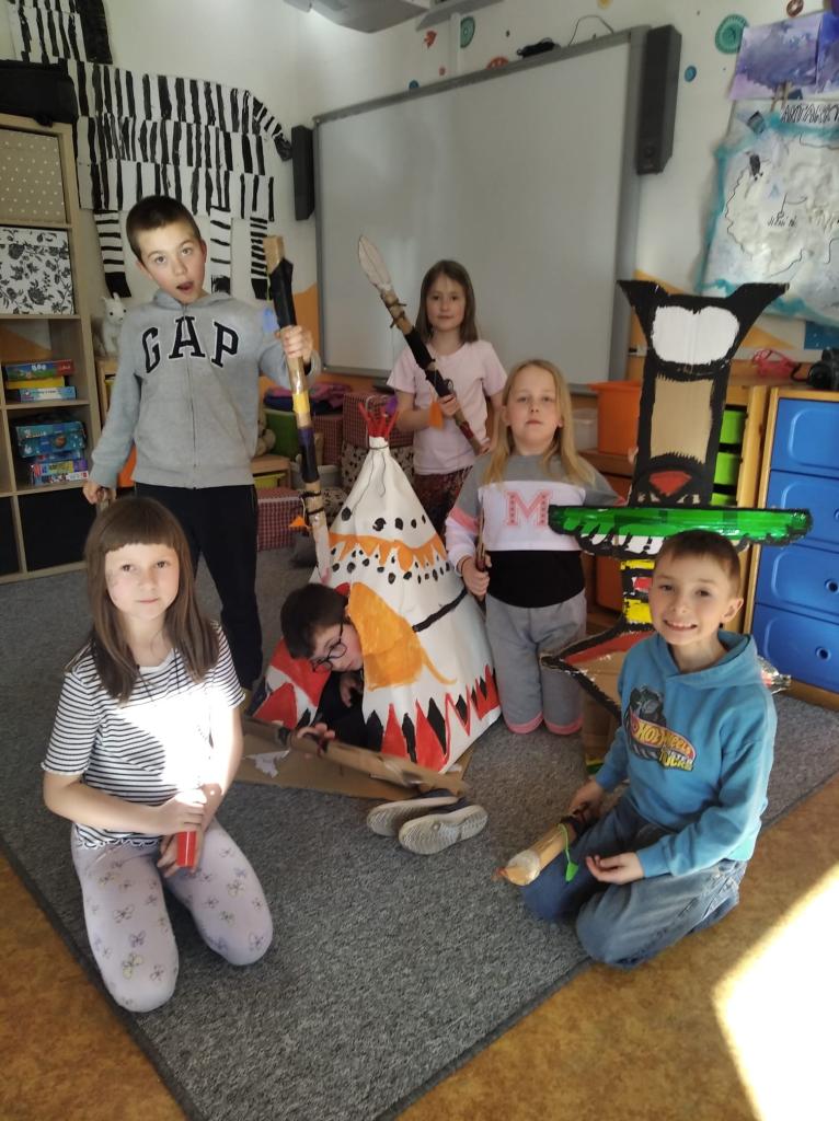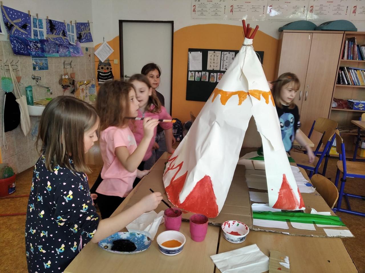Společně jsme se vydali do světa indiánů ze Severní Ameriky, kde jsme poznávali jejich život, tradice i hudbu. Postavili jsme malé týpí, totem, vyráběli lapače snů nebo oštěpy z kartonu a kůže a soutěžili v obratnosti a přesnosti. Každý si také zvolil své indiánské jméno a maloval vlastního indiána.