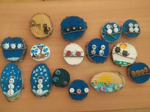 V družinových dílničkách pro 3 a 4 třídy jsme pracovali s březovými kolečky, samotvrdnoucí hmotou a barvami. Děti po přípravě polotovarů s nadšením kompletovaly svoje rybičky, kočičky, sovičky, ptáčky a sněhuláky.
