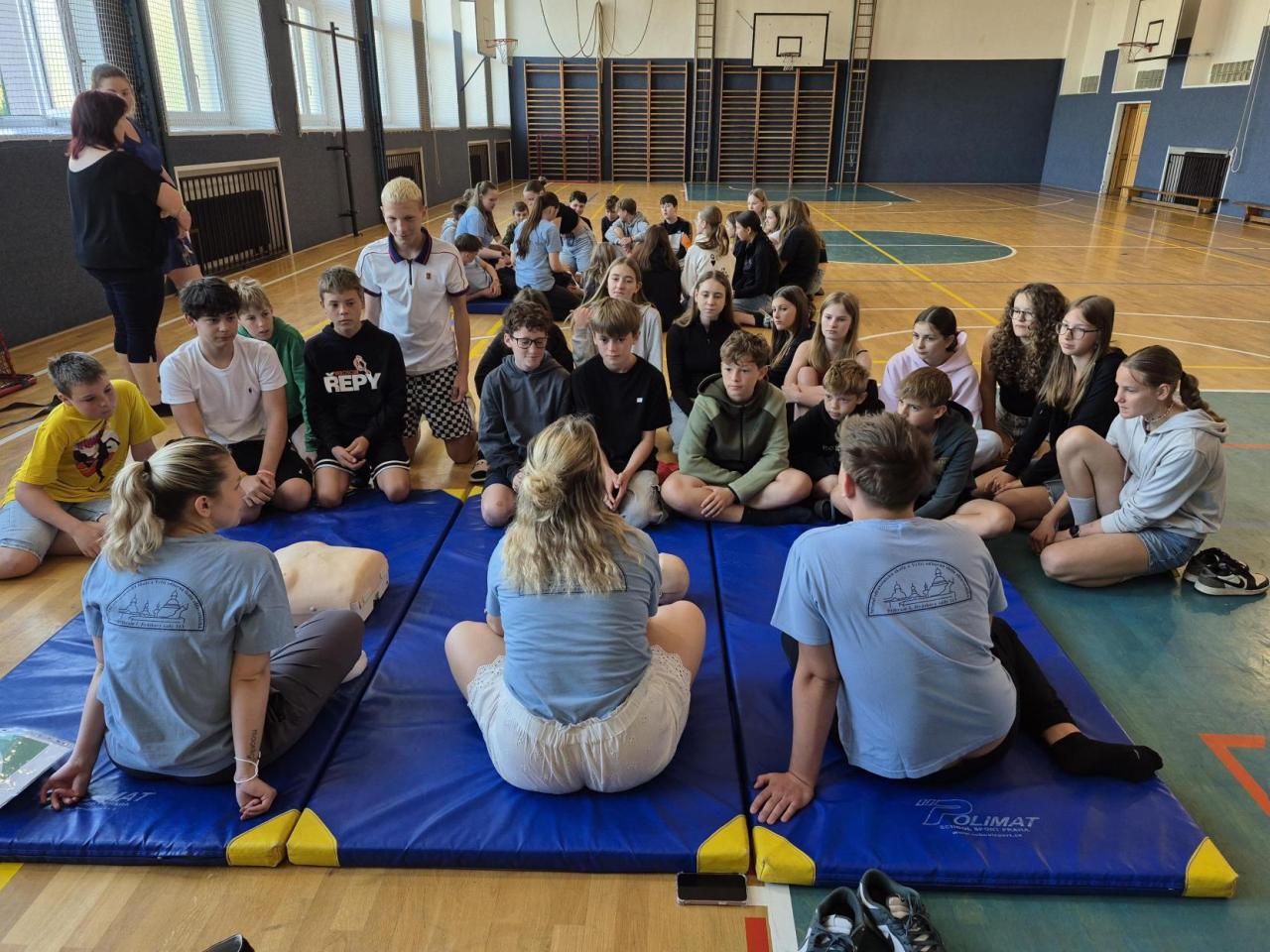 Děti z 1.-4. tříd se pohybovaly na stanovištích, kde pro ně žáci z devítek připravili nejrůznější úkoly, kterými prověřovali obratnost, znalosti z přírodovědy a zdravovědu. Ti z 5.-8. tříd se setkali s odborníky z řad zdravotníků, policie, hasičů.
