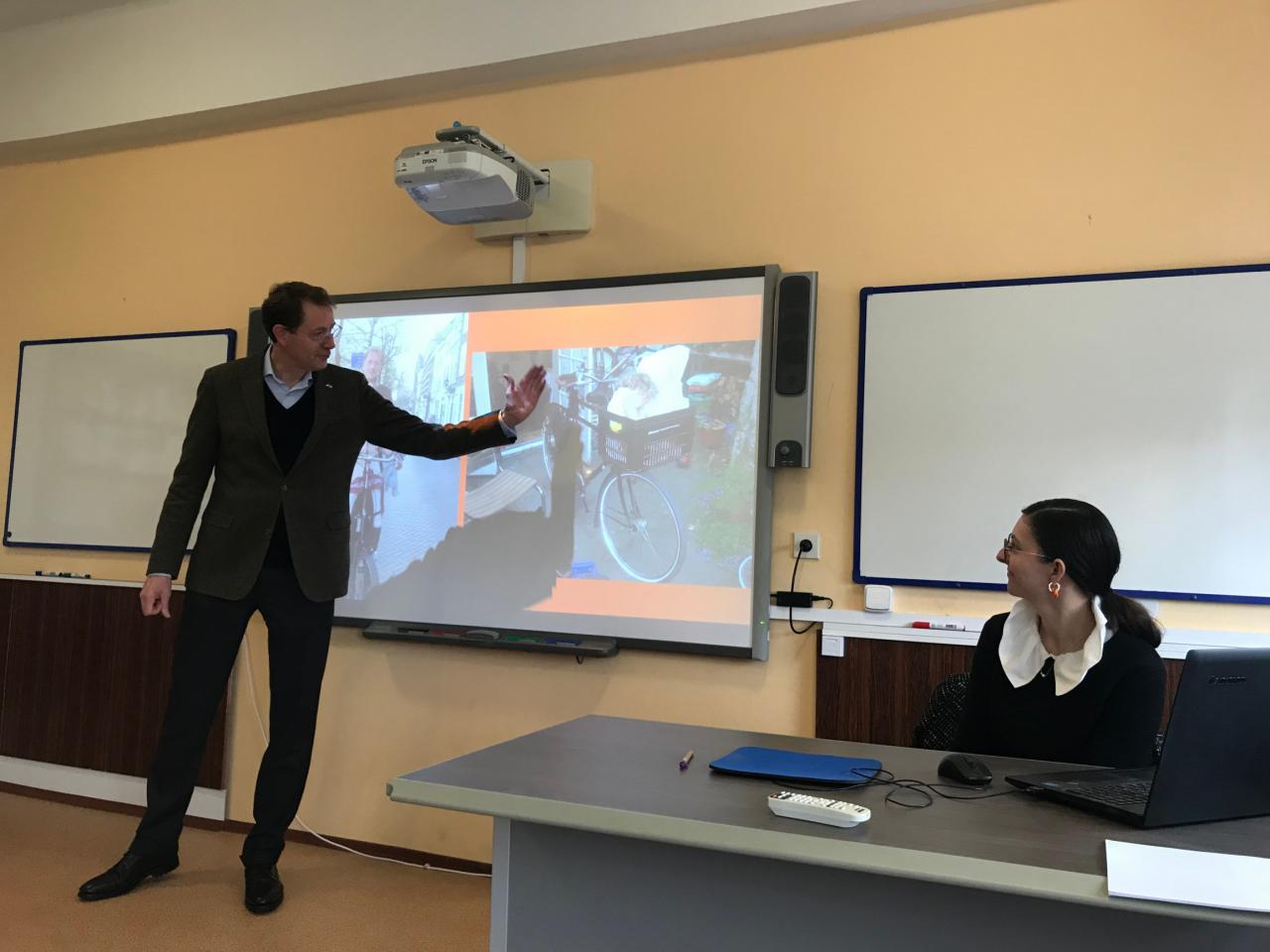 V úterý 25.4. proběhla na naší škole debata nizozemského velvyslance Daana Huisinga s žáky. Tématem debaty byla podpora cyklistiky jako jednoho ze způsobů městské dopravy. Žáci 1.ZŠ a 2.ZŠ Dobříš vyslechli poutavé vyprávění pana velvyslance o jeho vlastních zkušenostech s cestováním na kole, doprovázené zajímavou prezentací o historii cyklistiky v Nizozemí. Žáci měli možnost klást dotazy, čehož rádi využili a zjistili tak například i to, jak se nizozemsky řekne kolo: "fiets". Pan velvyslanec přijel do Dobříše podpořit projekt Pěšky do školy, který má za cíl zvýšit bezpečnost dětí a chodců pohybujících se v ranní špičce na hlavní ulici v blízkosti dobříšských škol. Debata