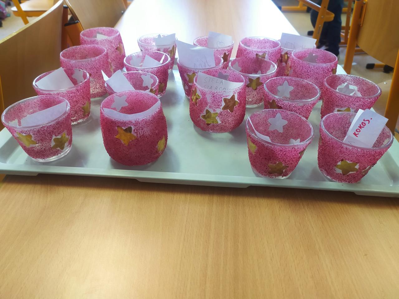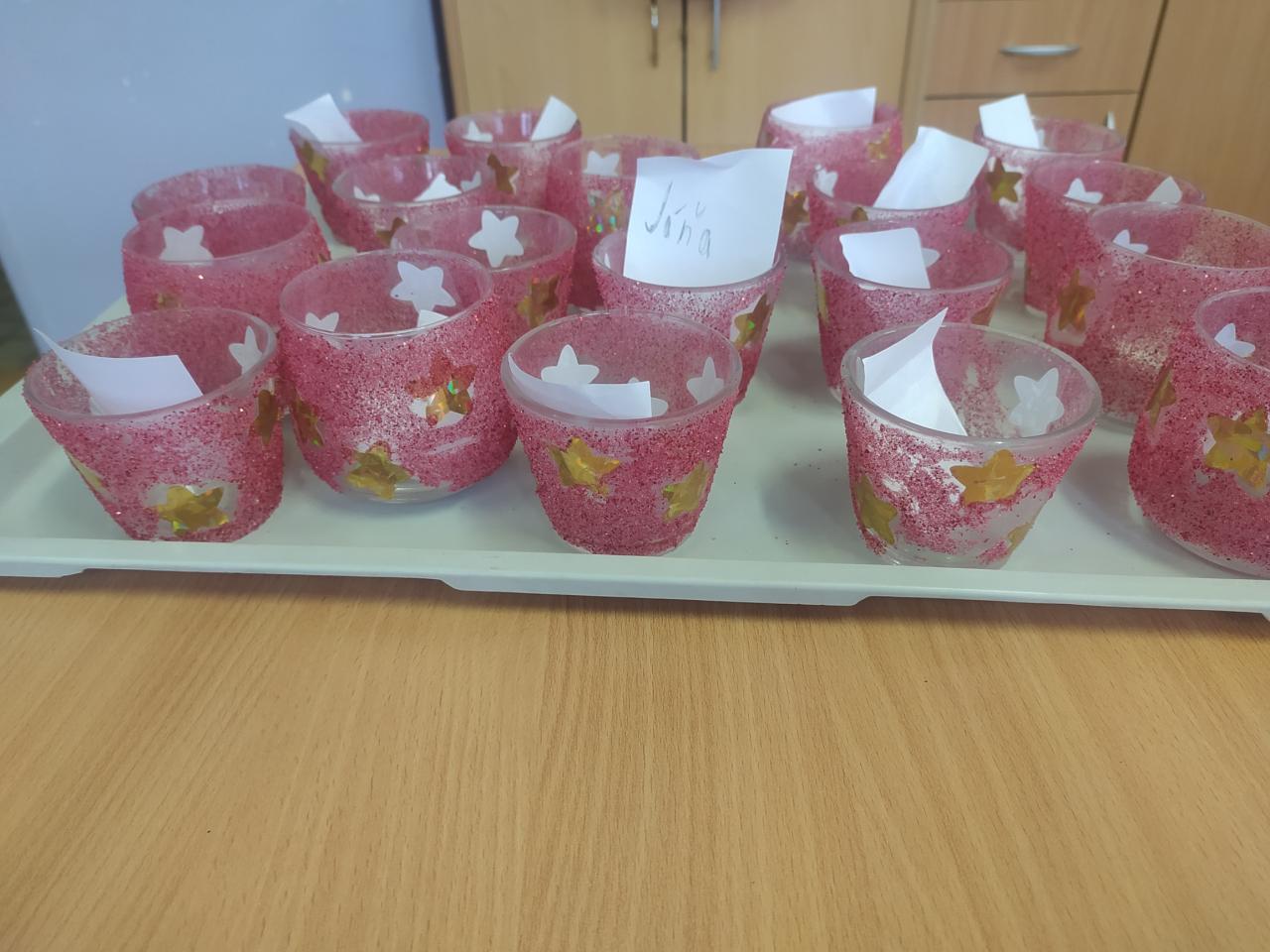 V pátek 29.11. proběhla další výtvarná dílnička 3.a 4.tříd. Děti si ozdobily své vánoční stromky, které si ušily minulou dílničku. V pátek si ještě vytvořily svícen. Skleničku polepily hvězdou, natřely lepidlem a na závěr posypaly třpytky. Vše si odnesly domů.
