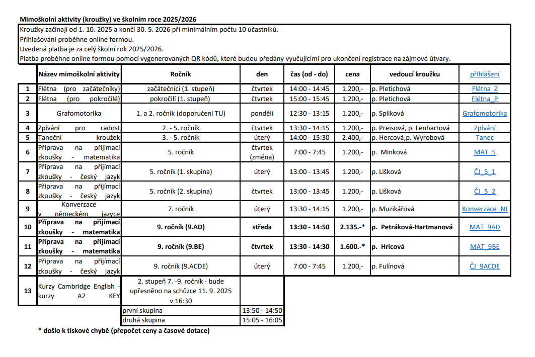 Níže naleznete seznam mimoškolních aktivit (kroužků) ve školním roce 2025-2026.