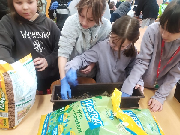 V další části dopoledne jsme si vyzkoušeli, jak se sází zelenina nebo i bylinky do truhlíků. Už se těšíme, až budeme pozorovat, jak nám naše zelenina poroste. Hodně moc našemu zdraví přispívá pohyb na čerstvém vzduchu. Proto jsme se společně vydali do Anglického parku na svižnou procházku. Starší děti pro své mladší spolužáky nachystaly šipkovanou s plněním jednoduchých úkolů v přírodě.