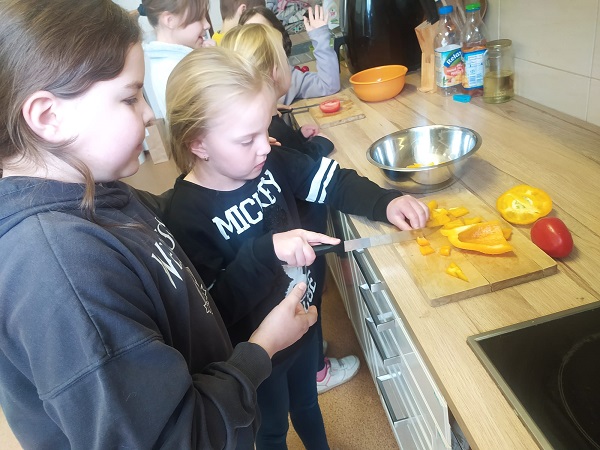 Třída V. C si společně s přípravnou třídou ve školní kuchyni nachystala zdravou svačinku. Děti pojmenovávaly jednotlivé druhy zeleniny a říkaly, čím jsou pro naše zdraví přínosné. Všichni si nakrájeli zeleninu na salát a společně jsme si na něm pochutnali.