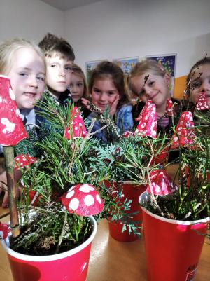 Během výtvarného kroužku si děti vytvořily kousek lesa s muchomůrkami v papírovém kelímku. Kombinoval se přírodní a odpadový materiál (nosiče na vajíčka).