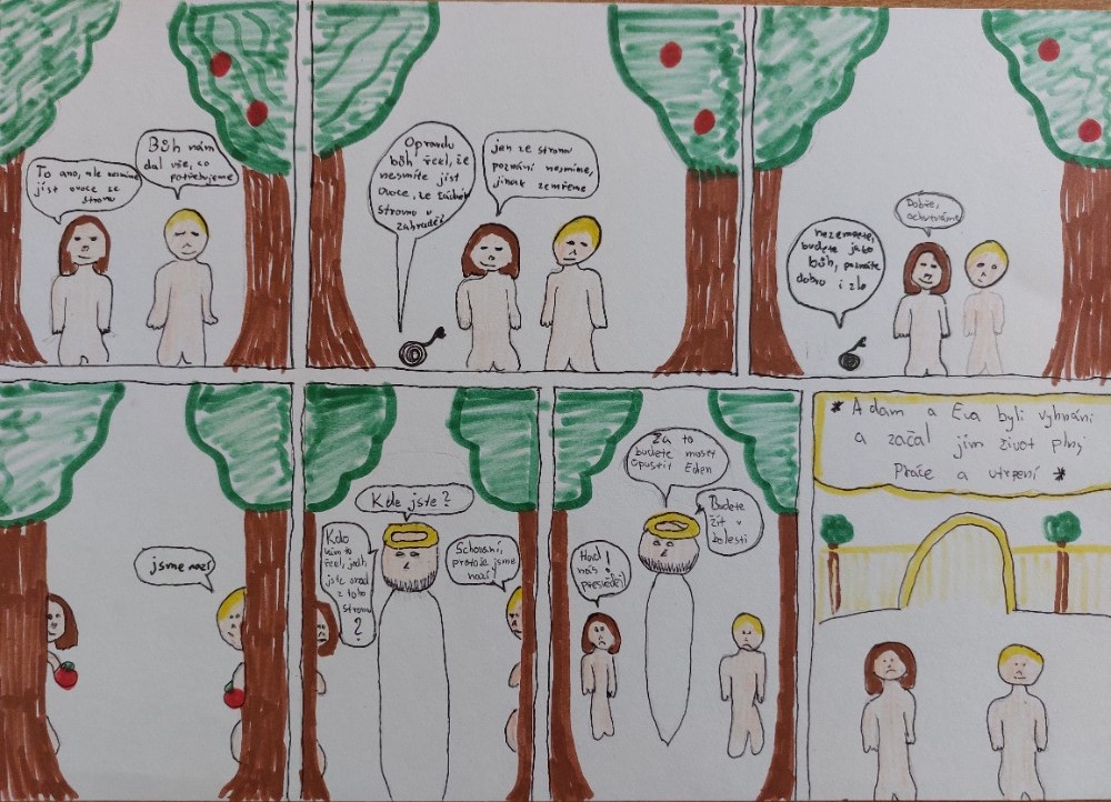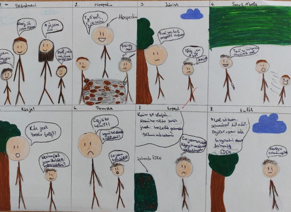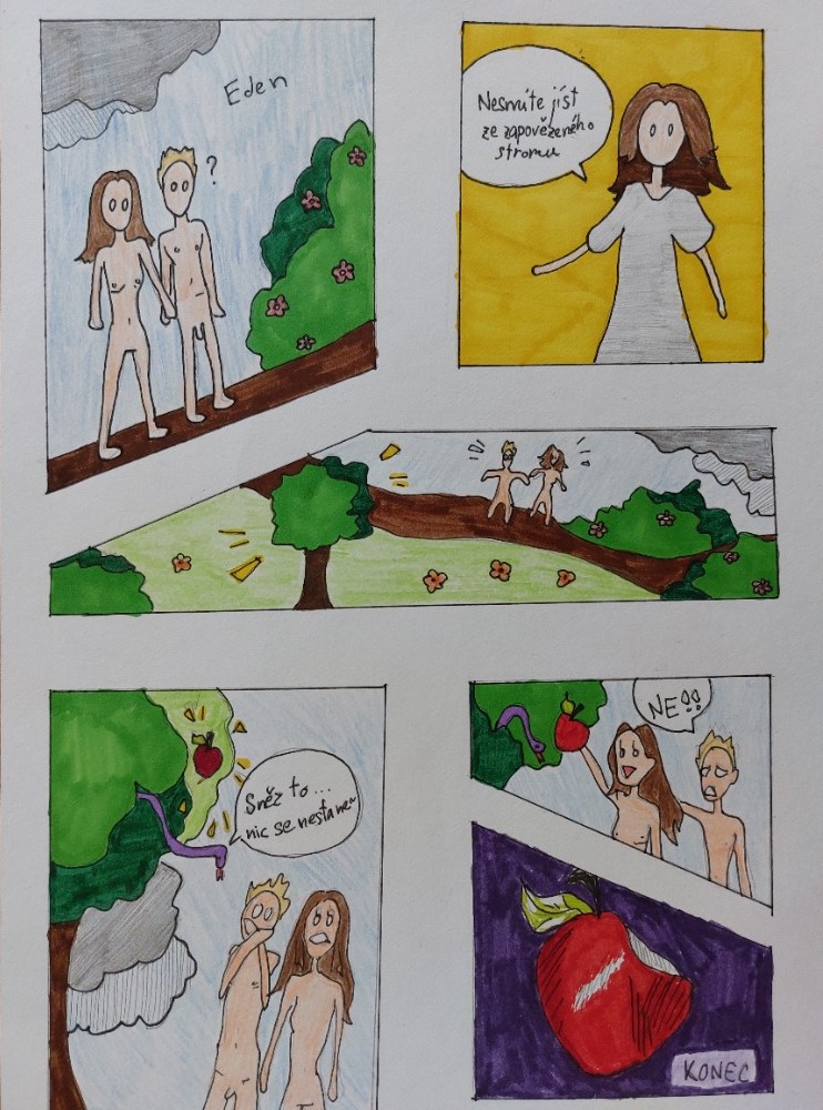 V 8.C a 8.D jsme si při výuce literatury 20. století povídali i mimojiné o Ivanu Olbrachtovi a jeho díle, kam patří i Biblické příběhy. Žáci dva příběhy, o Adamovi a Evě a o Kainu a Abelovi přepracovali do podoby komiksu, který musel mít minimálně šest okének.