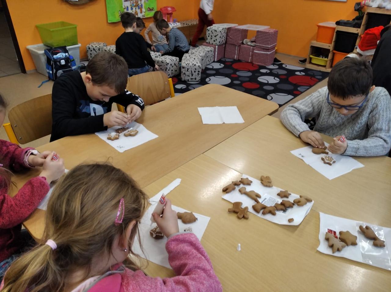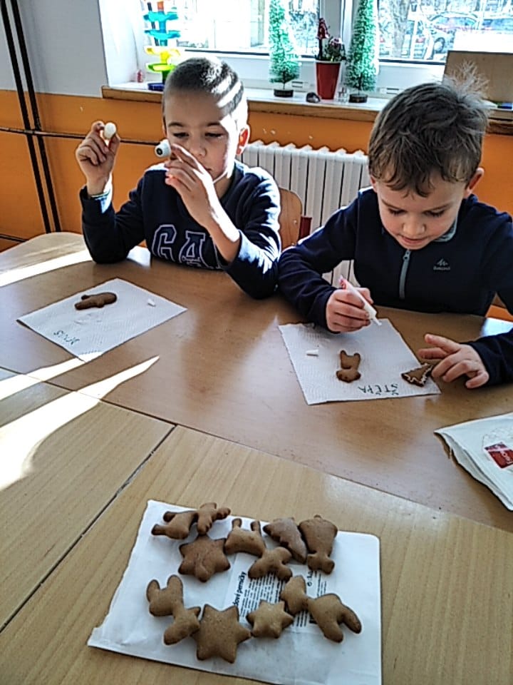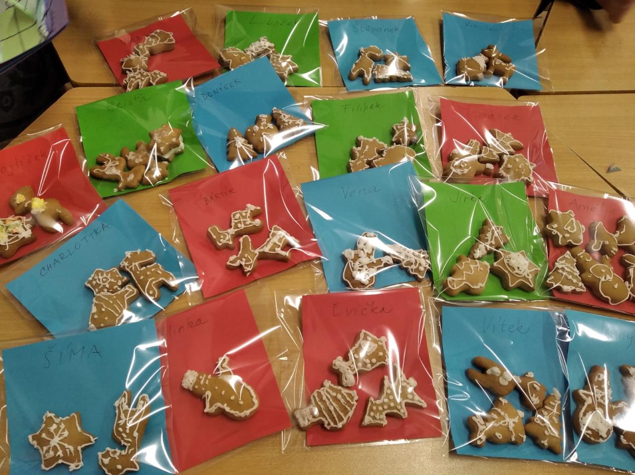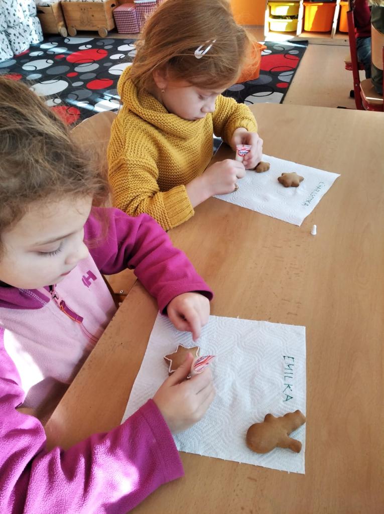 S prvňáčky jsme ve družině v předvánočním čase malovali na perníčky. Každý si ozdobil několik perníčků, které si pak dárkově zabalené odnesl domů.