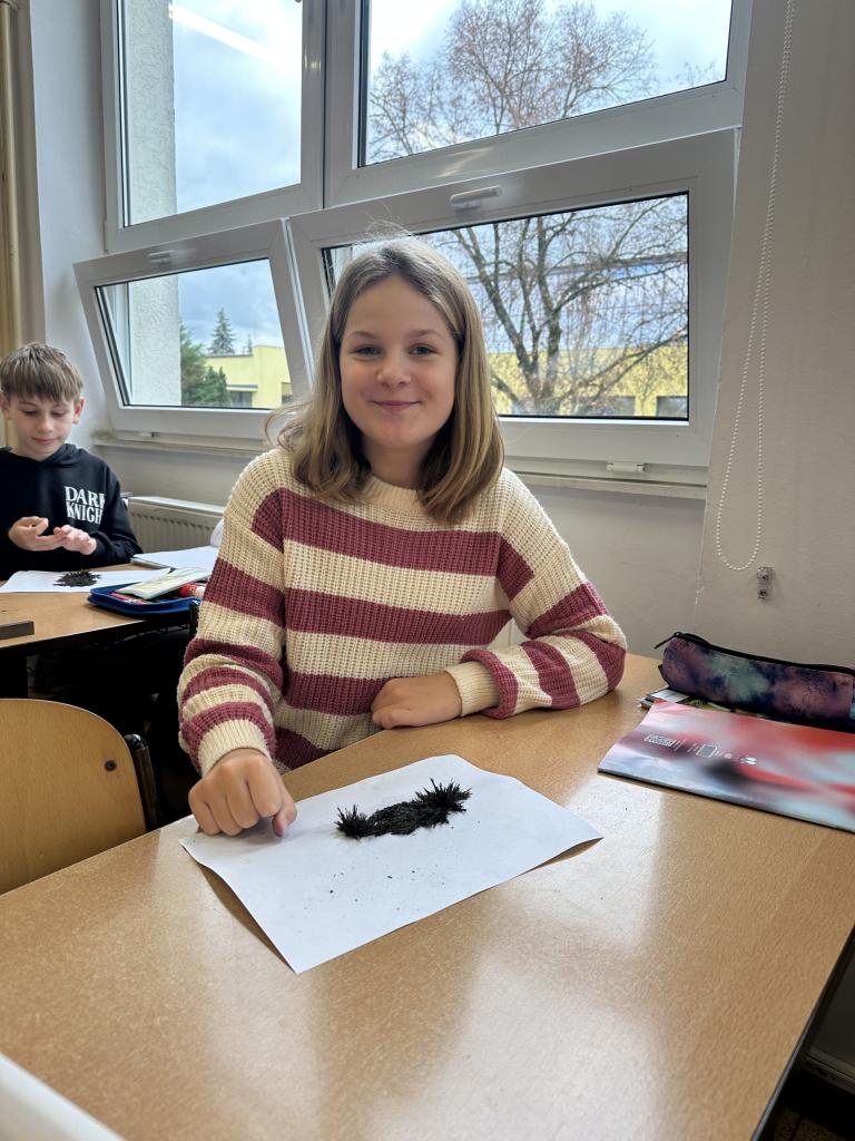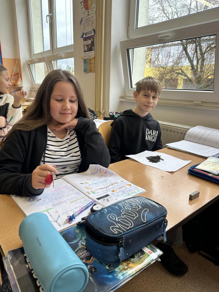 Vyvrcholením hodiny byl pokus s kovovými třískami. Žáci pomocí magnetu pozorovali, jak se kovové částice seskupují podle siločar magnetického pole. Tento vizuálně atraktivní experiment jim pomohl lépe pochopit neviditelnou sílu, která magnety obklopuje.