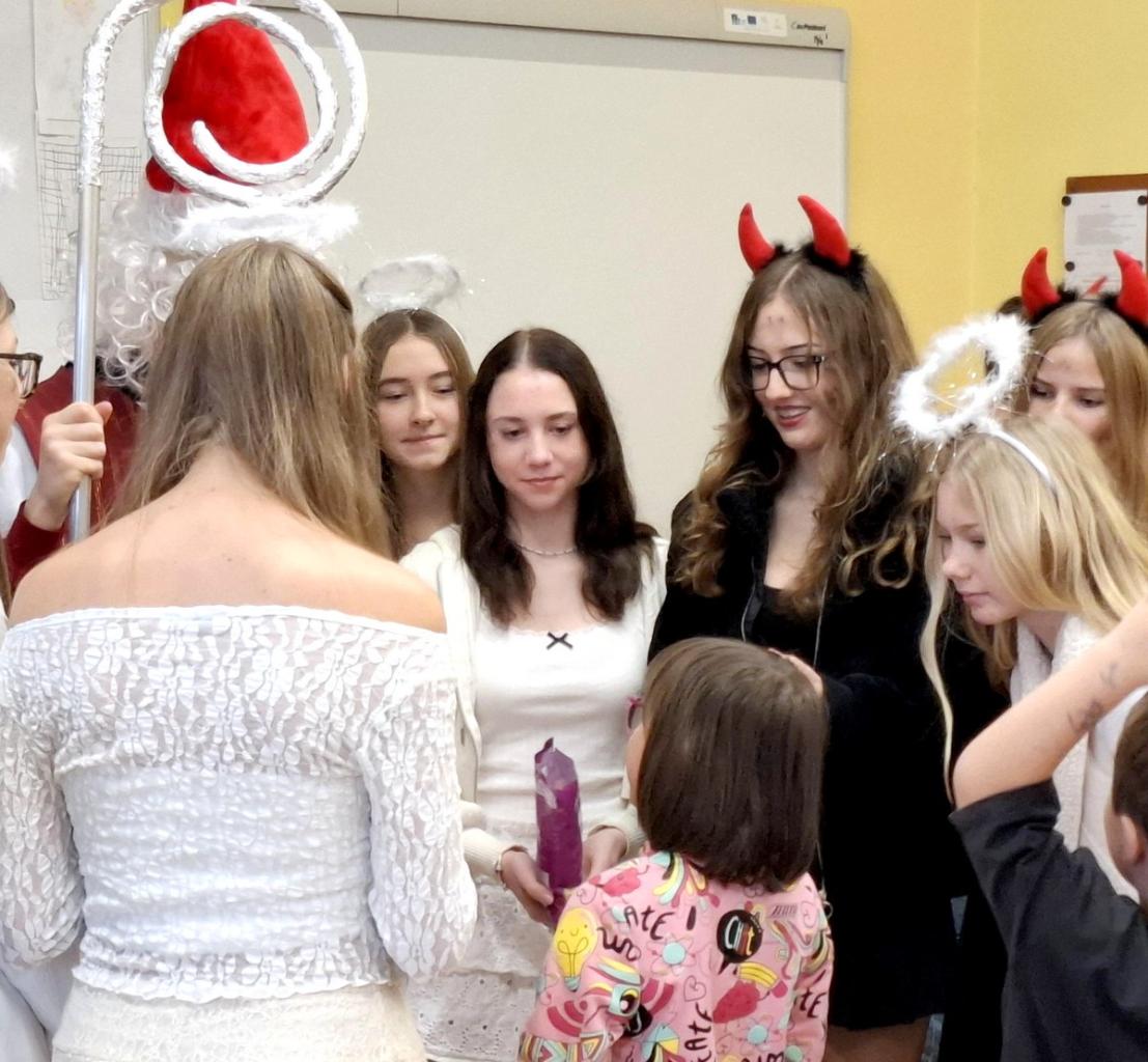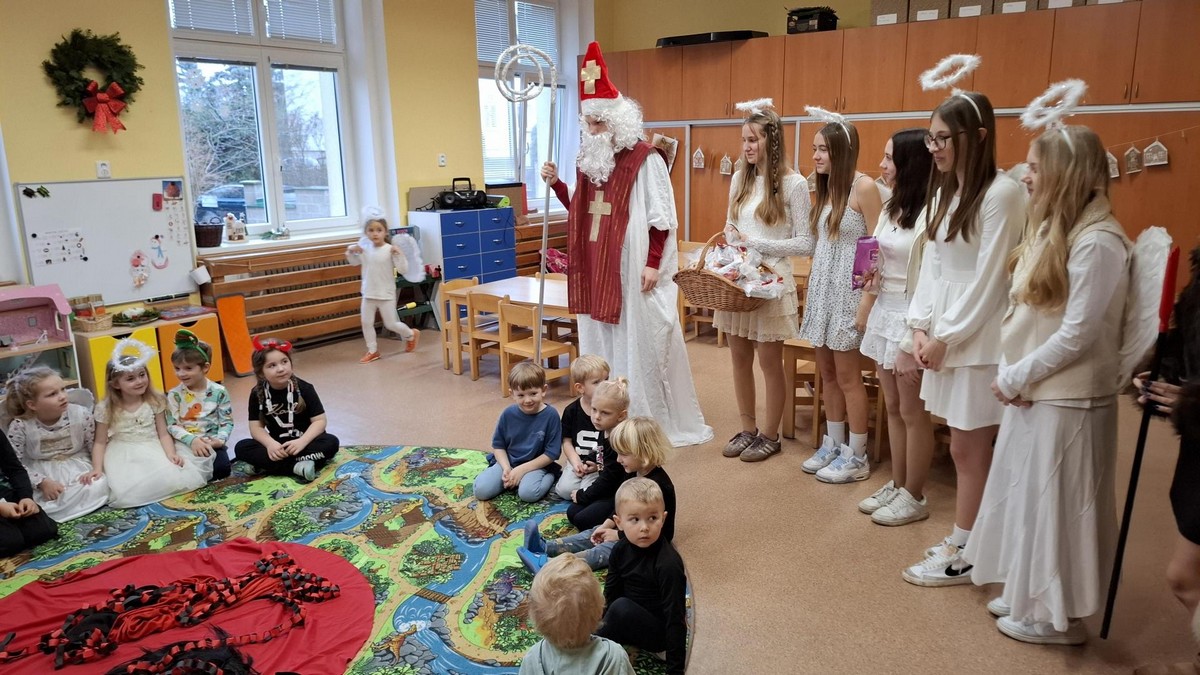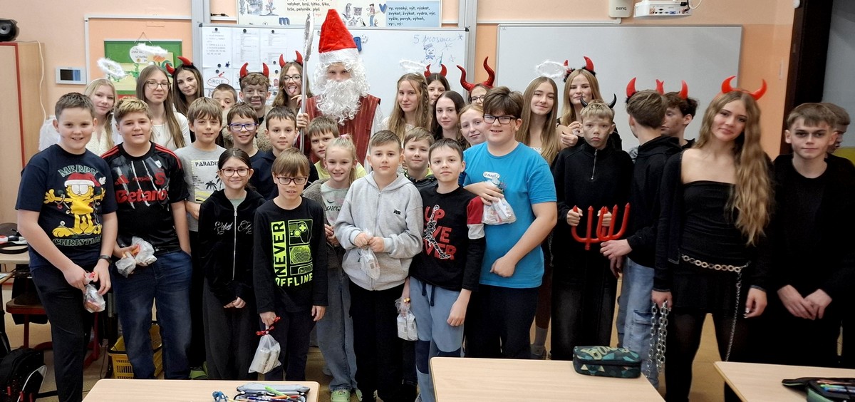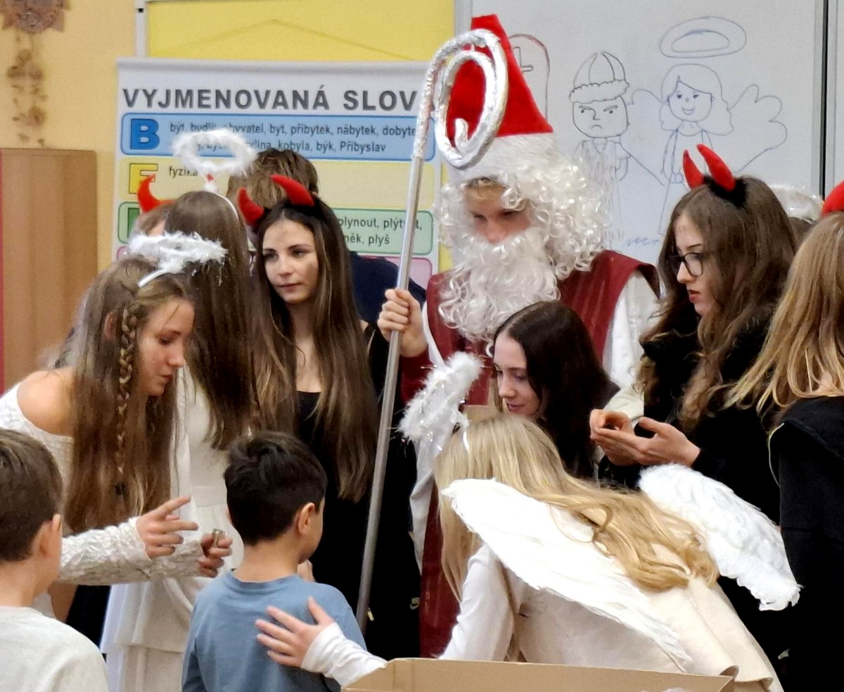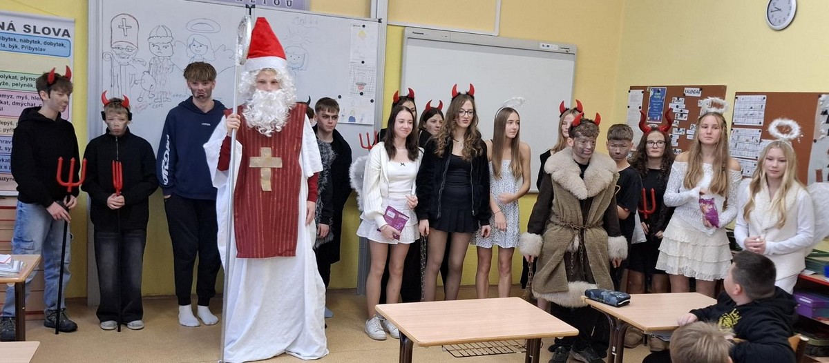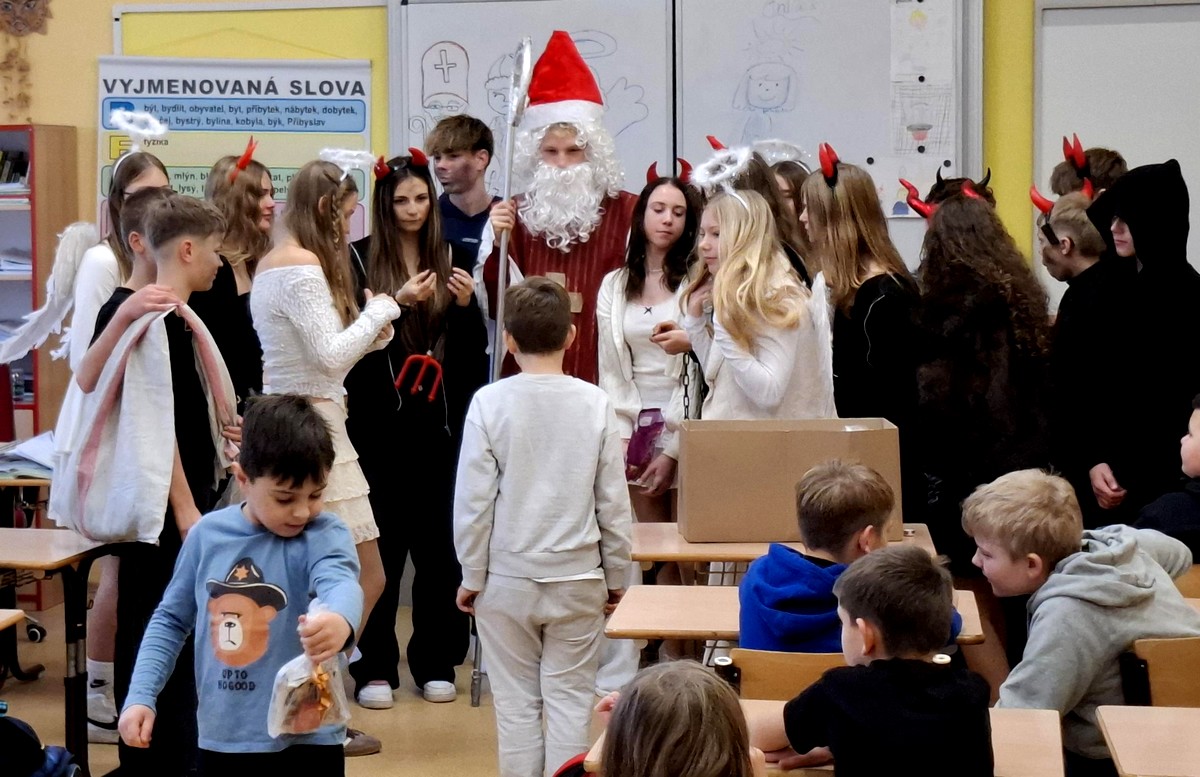 Dne 5. 12. 2025 jsme zavítali se třídou VIII. A do ZŠ a MŠ Obořiště, kde naši žáci potěšili děti z obořišťské školy a školky svou návštěvou v kostýmech Mikuláše, čertů a andělů.