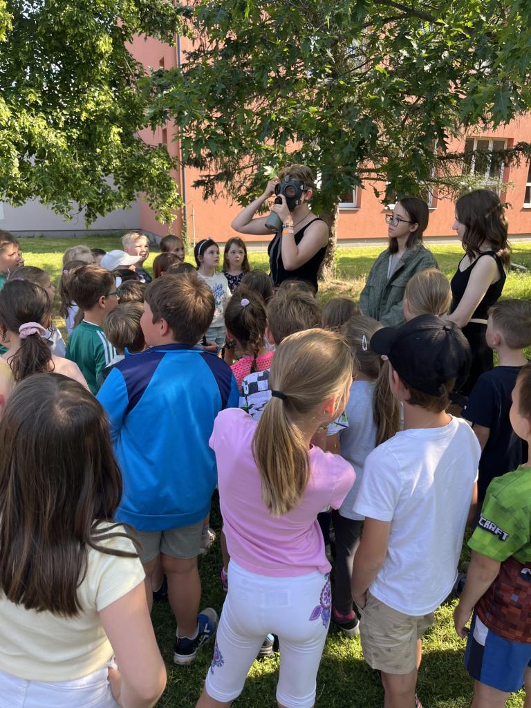 Na dalším stanovišti si žáci mohli vyzkoušet vybavení z branné výchovy, jako např. plynovou masku, a dozvědět se více o tom, co obnášela výuka v minulých dekádách.